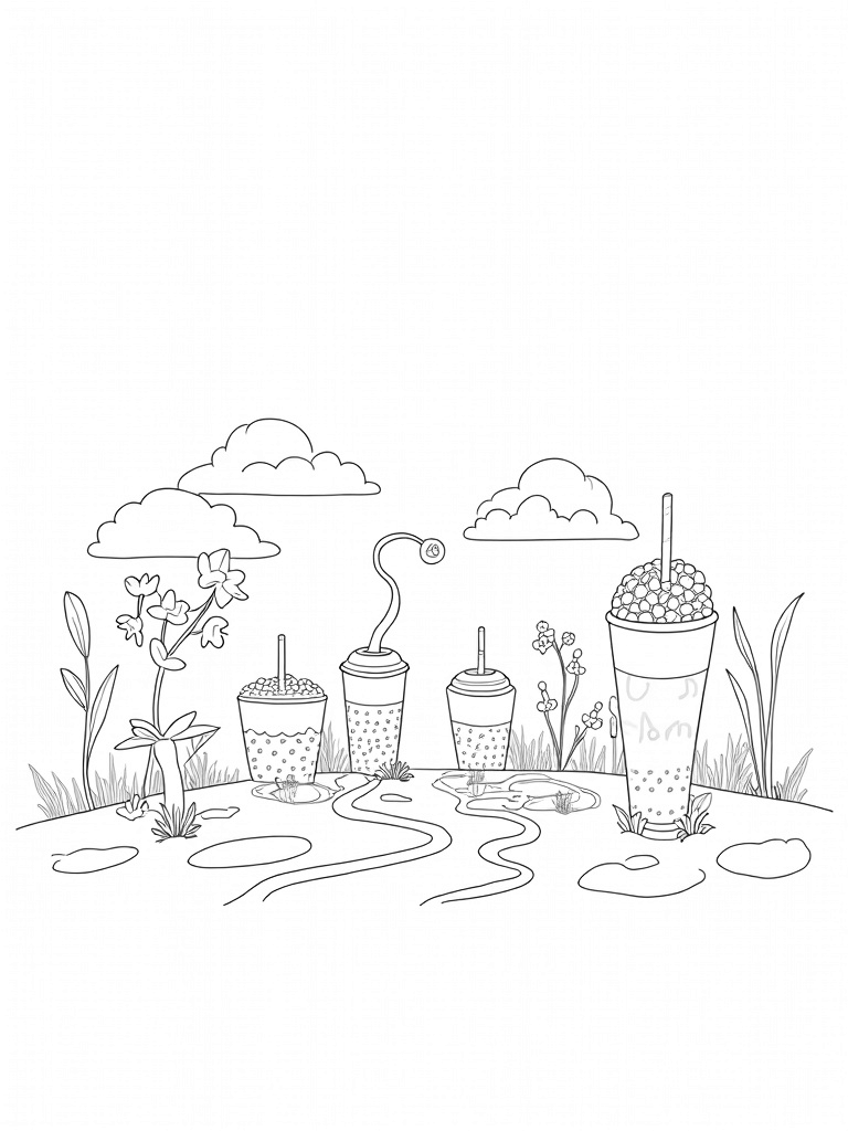 Oversized Boba Cups in a Whimsical Tea Garden Coloring Page