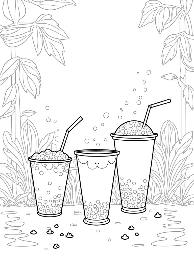 Oversized Boba Cups in a Whimsical Tea Garden Coloring Page