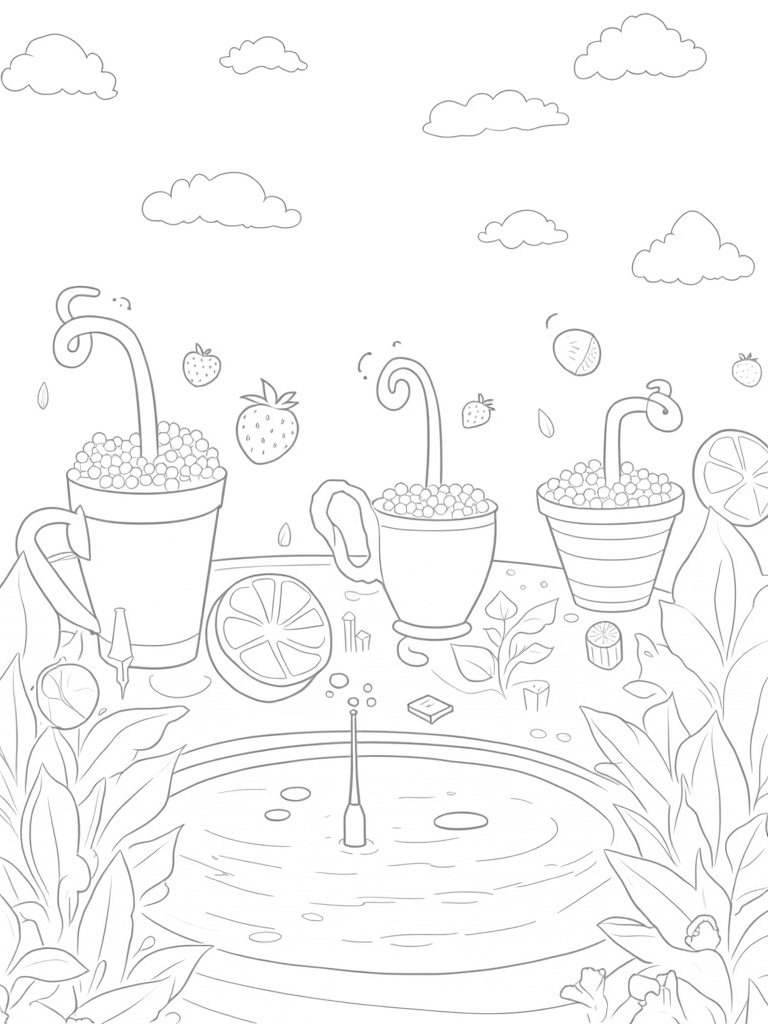This fun coloring page shows a delightful garden filled with giant boba tea cups overflowing with colorful tapioca pearls. Each cup has a straw that twists and twirls towards the fluffy clouds above. Look closely, and you’ll see giant fruit slices like strawberries and oranges floating around, casting playful shadows on the ground!