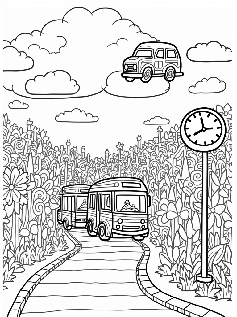 You’ll find a super fun scene where a cloud shaped like a bus floats through a sky filled with swirly patterns. Below, a winding road made of bright, rainbow-colored bricks leads to a city bursting with oversized flowers, each petal flaunting its own unique color. It’s a vibrant world that’s just waiting for your creative touch!