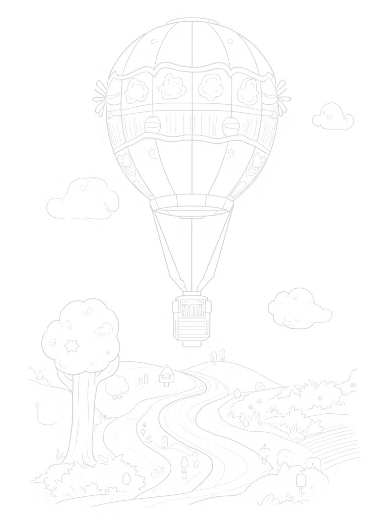 Imagine a hot air balloon shaped like a bus gently floating above a vibrant patchwork of hills and fields. The balloon is covered in fun patterns of gears and flowers, making it a real eye-catcher! Below, there’s a winding road lined with silly bus stop signs, each showcasing a different adorable animal waiting impatiently. It’s a playful scene that’s sure to spark a child’s imagination.