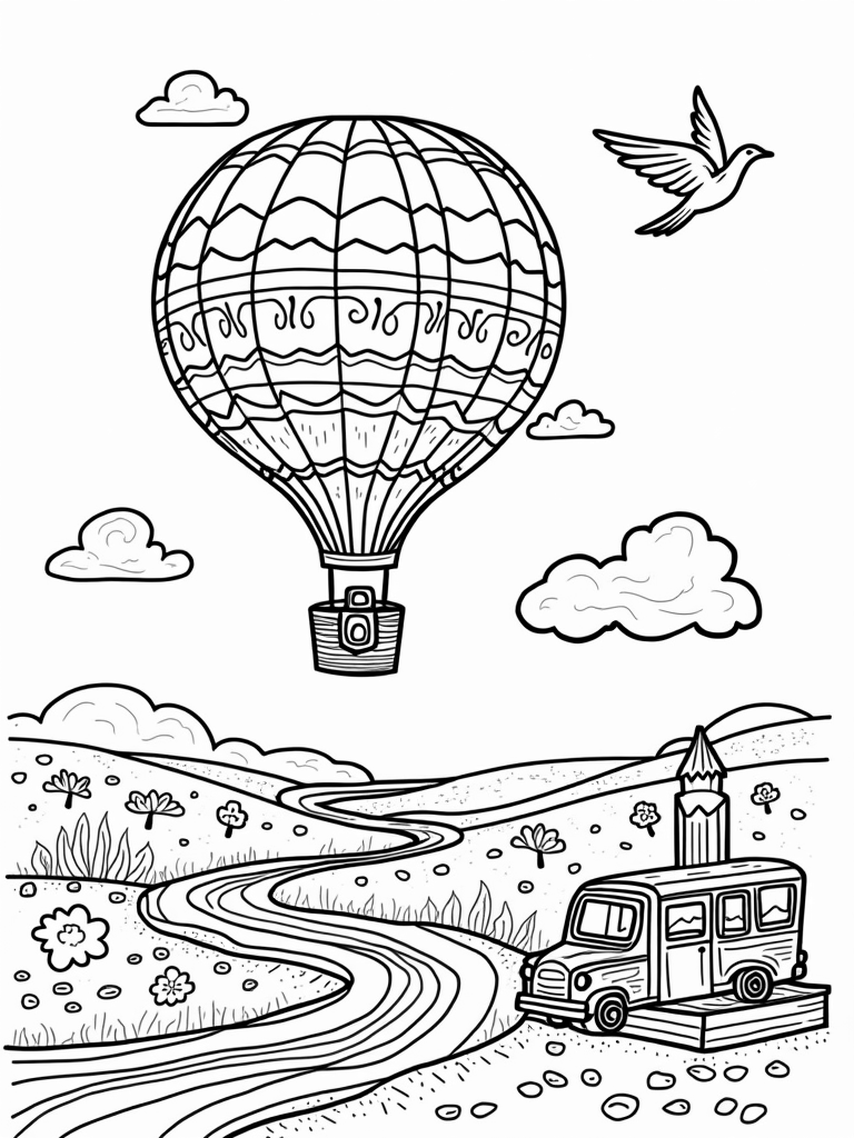 This coloring page showcases a super fun bus-shaped hot air balloon floating lazily over a colorful patchwork landscape. Below, you can spot fields and rivers that look like they were stitched together from a quilt! The balloon's canopy is bursting with vibrant patterns of flowers and geometric shapes, making it a delightful sight to color.