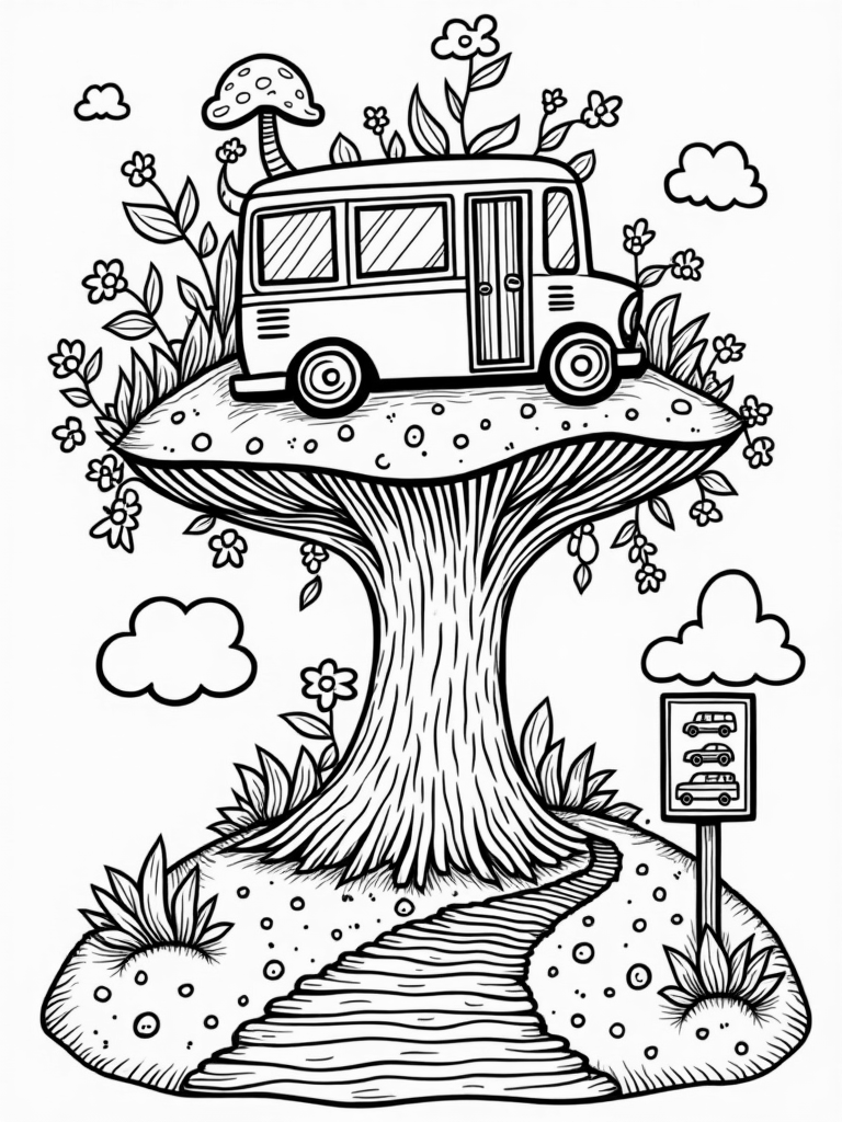 Bus-Shaped Treehouse on a Giant Mushroom Coloring Page