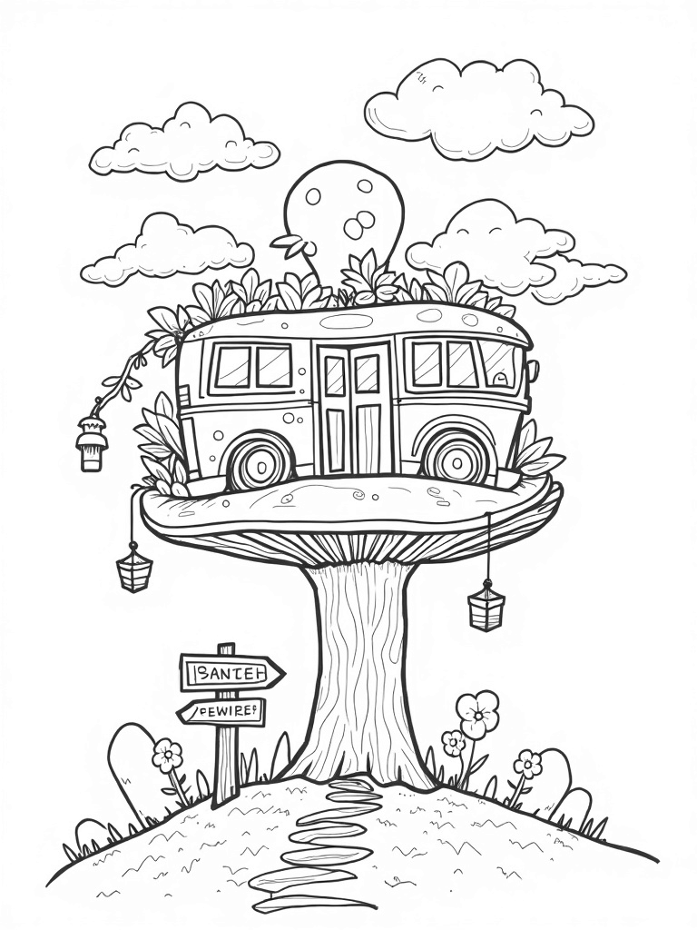 Bus-Shaped Treehouse on a Giant Mushroom Coloring Page