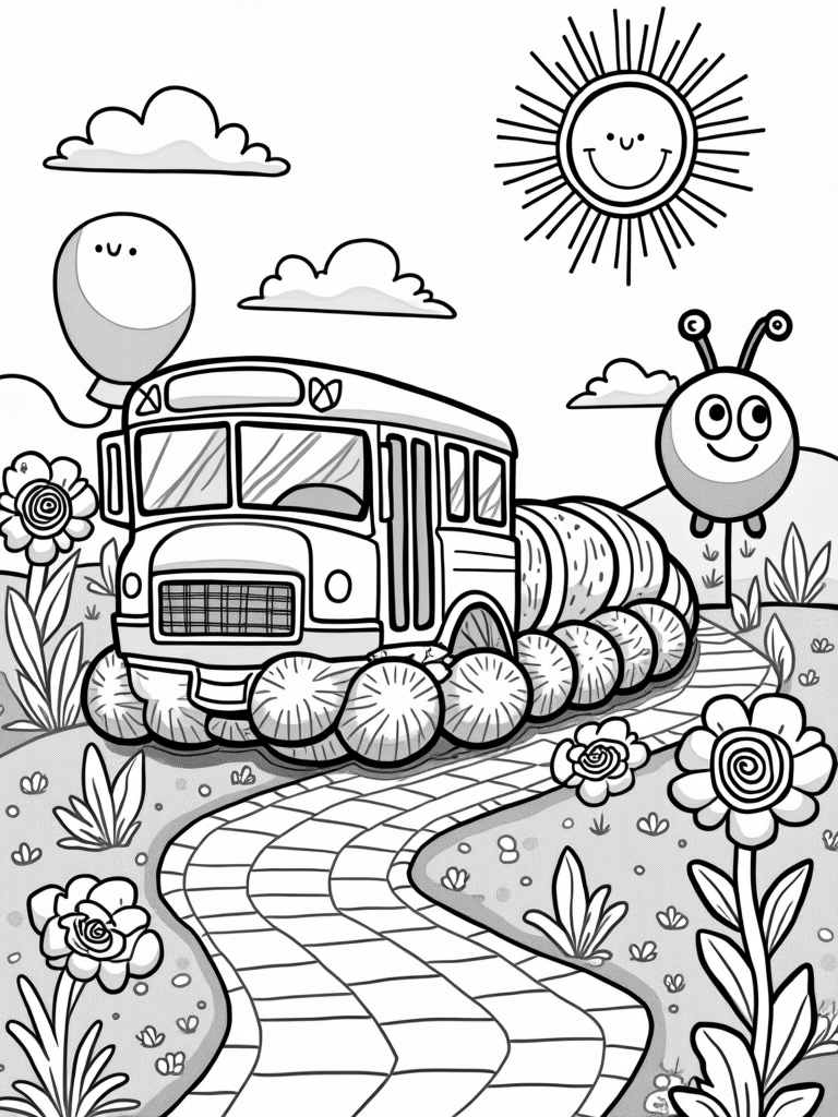 You won't believe your eyes when you see this amazing caterpillar bus! It’s not just any bus; it's a giant caterpillar with a colorful, segmented body that's perfect for coloring. It's lounging on huge, leafy greens, surrounded by flowers that look like they were made in a candy shop with their spiral petals. Plus, take a look at that winding road made of multicolored bricks leading to a fun horizon!