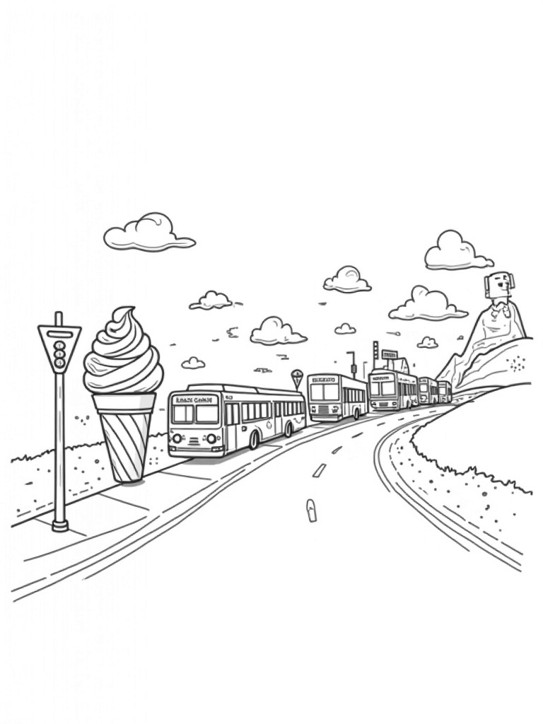 Look closely and you’ll spot a quirky bus stop made of giant traffic signs and street lamps, sitting under a sky filled with fluffy clouds that seem to float by. In the backdrop, a winding road curves around a hill, where a playful rock formation shaped like a bus peeks out from the greenery. So many fun details to bring to life with your favorite colors!