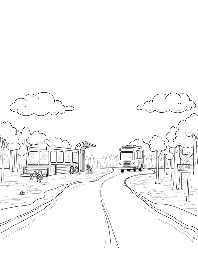 On the side of the road, there’s a giant bus made entirely of flowers and leaves, with swirling patterns painted on its windows. It’s like nature and creativity combined! Nearby, trees with bus stop signs as their fruits sway gently in the breeze, adding to the playful atmosphere.