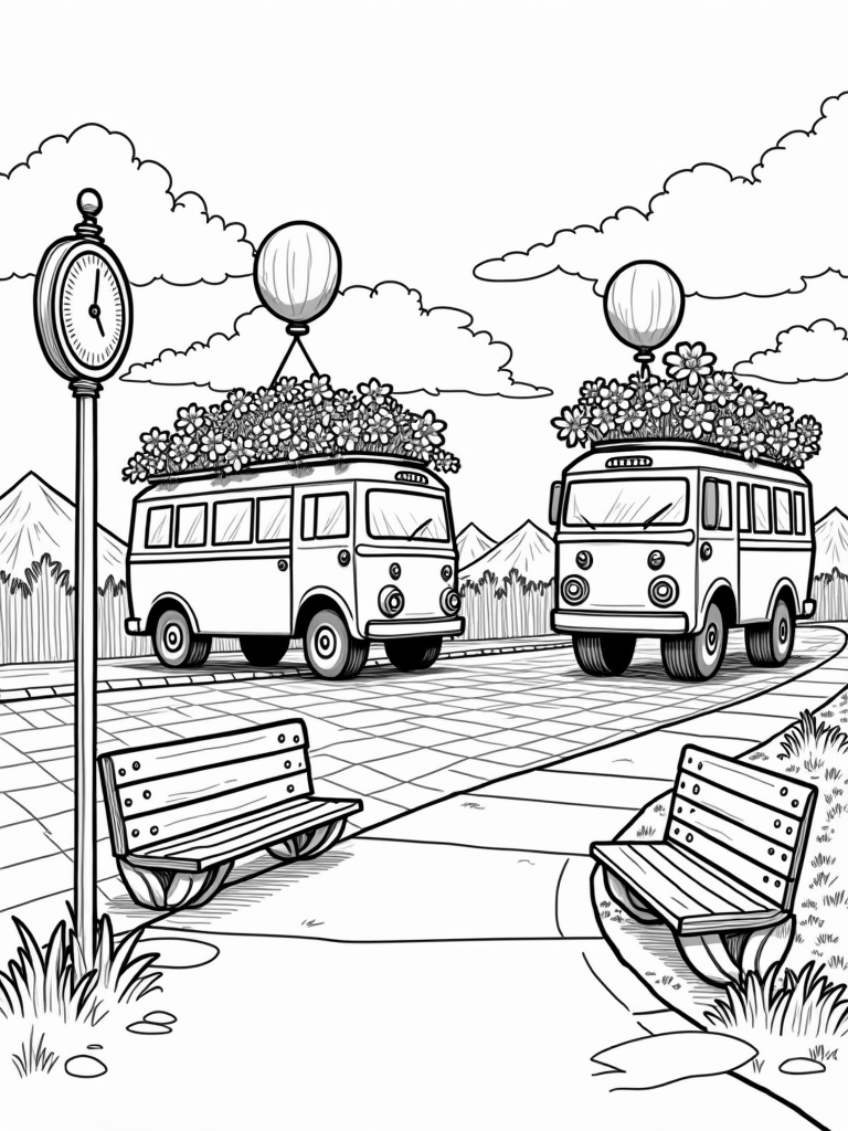 Imagine a bustling city where the buses float above the cobblestone streets! Instead of wheels, these oversized buses are lifted by bright, colorful balloons. On top, you'll find lush rooftop gardens bursting with vibrant flowers that seem to dance in the air. Nearby, a giant bus stop sign with clock faces shows different times, adding to the fun and whimsy of this scene.