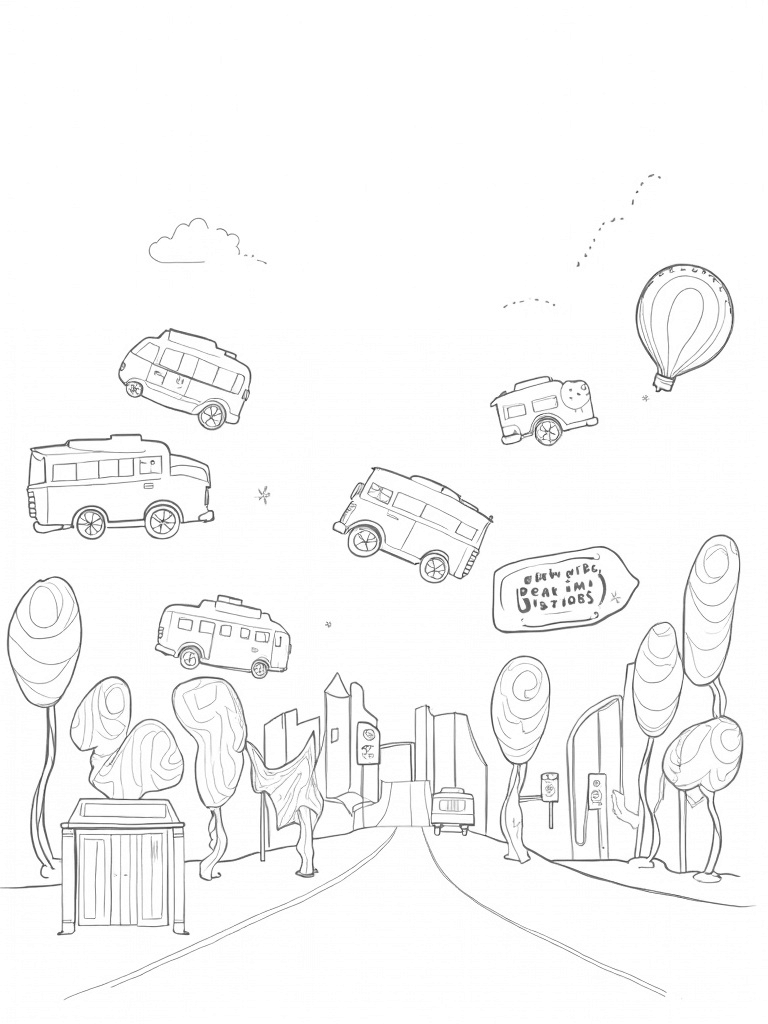 Imagine a city where buses float high above the ground, held up by colorful balloons instead of wheels! Below, vibrant trees twist and swirl along the streets, creating a backdrop for a bus stop made entirely of oversized pencils. It’s a playful twist that makes waiting for the bus a little more fun!