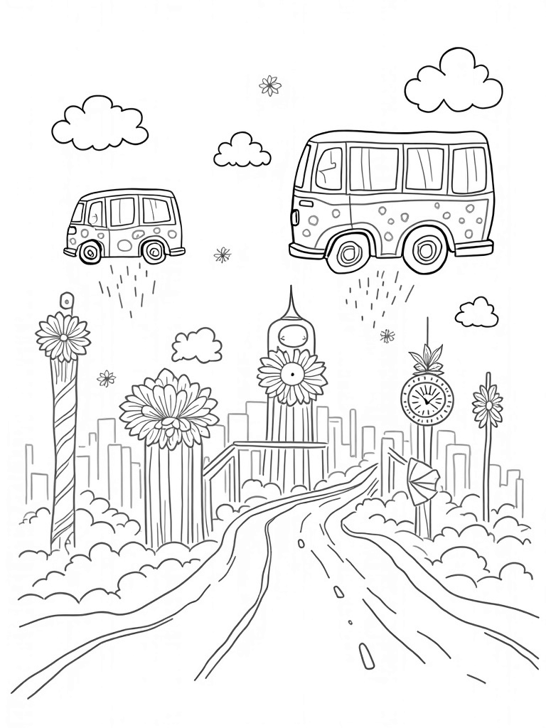 Floating Buses in a Candy Cloud Cityscape Coloring Page