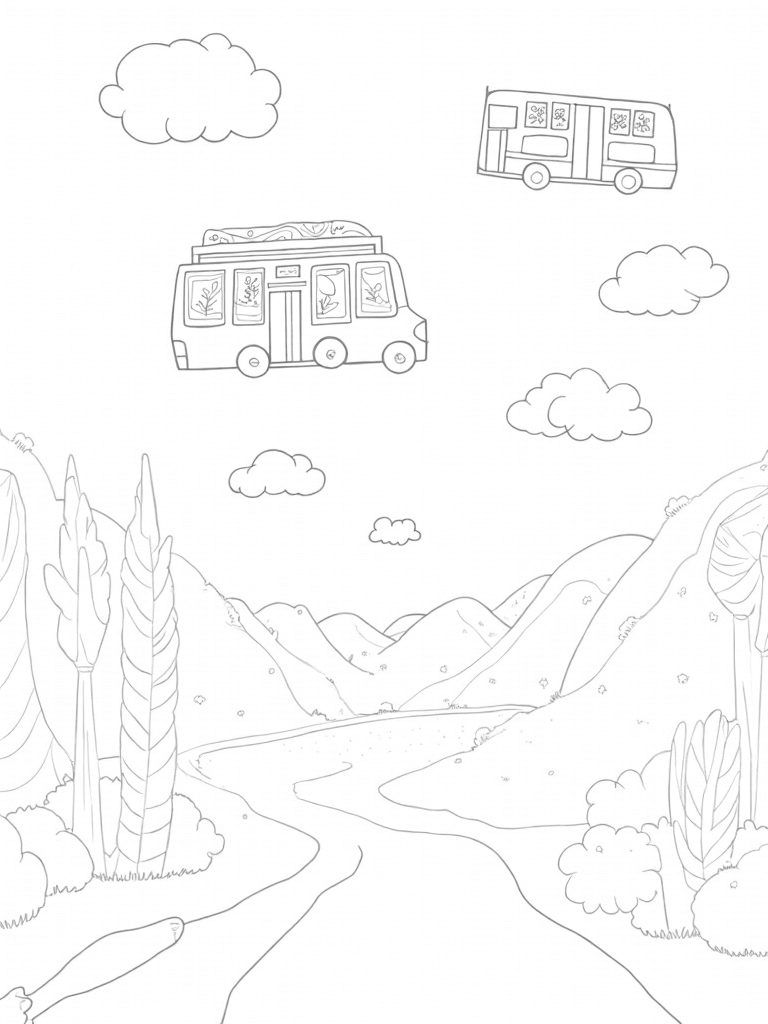 Picture a world where buses don't just drive on roads but float among the clouds! These oversized buses are decorated with vibrant patterns that are just begging for your favorite colors. And if you peek inside the windows, you'll find magical gardens bursting with colors. Can you imagine the flowers and plants that might grow in there?