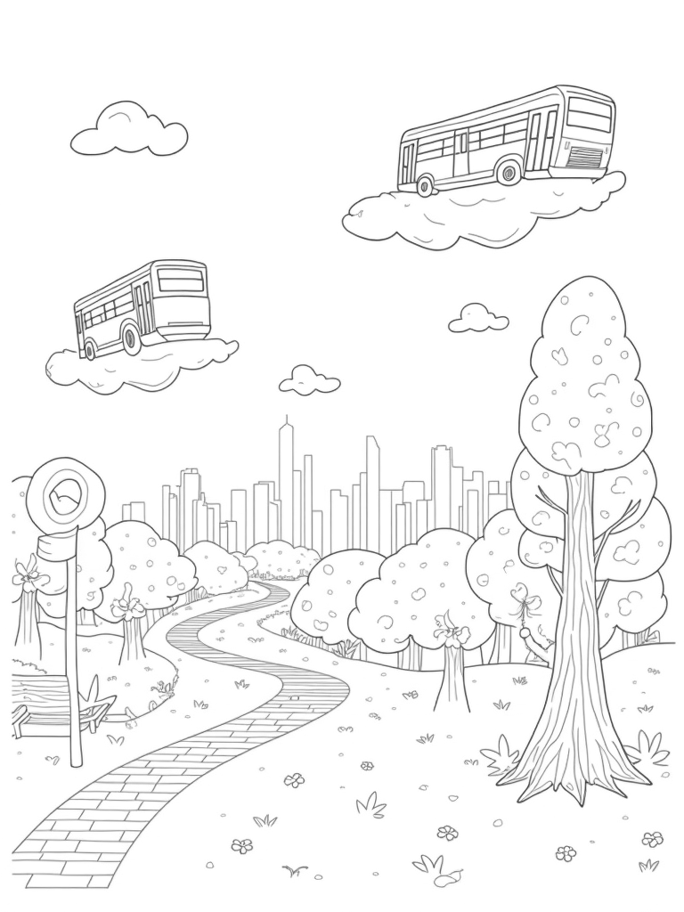 In the background, the skyline is anything but ordinary! Buildings are designed to resemble different bus models, each one adorned with bright patterns and intricate details. It’s like a city that’s come alive with creativity! Imagine the fun of coloring these unique shapes and patterns, bringing them to life with your favorite colors.