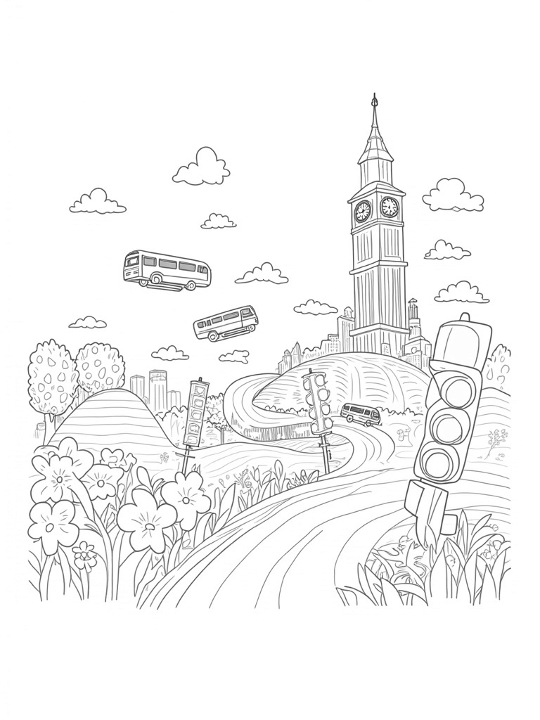 In this fun cityscape, you’ll find oversized, colorful buses gliding through a bright blue sky like airships! Beneath them, a winding road made of rainbow bricks spirals through lush green hills, inviting you to color each section in vibrant hues. The edges of the road are lined with large, blooming flowers featuring intricate patterns that will spark your creativity.