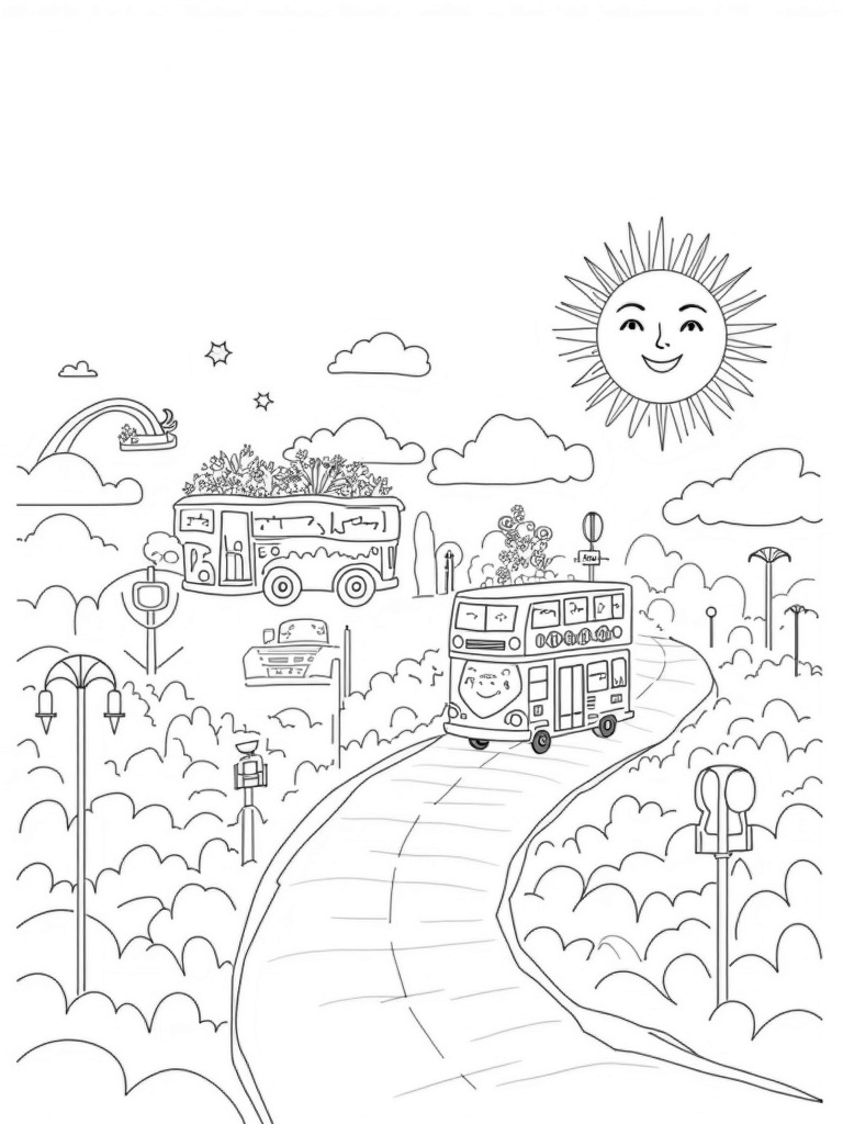 Get ready to color a bustling city where buses float among fluffy clouds! One bus is shaped like a giant teapot, with a spout that pours out bright, cheerful rainbows. Nearby, a double-decker bus has turned into a beautiful garden, with colorful flowers blooming from the top deck. The cobblestone road winds through this magical scene, dotted with oversized traffic signs and fun streetlamps, all under the watchful eye of a giant, smiling sun.