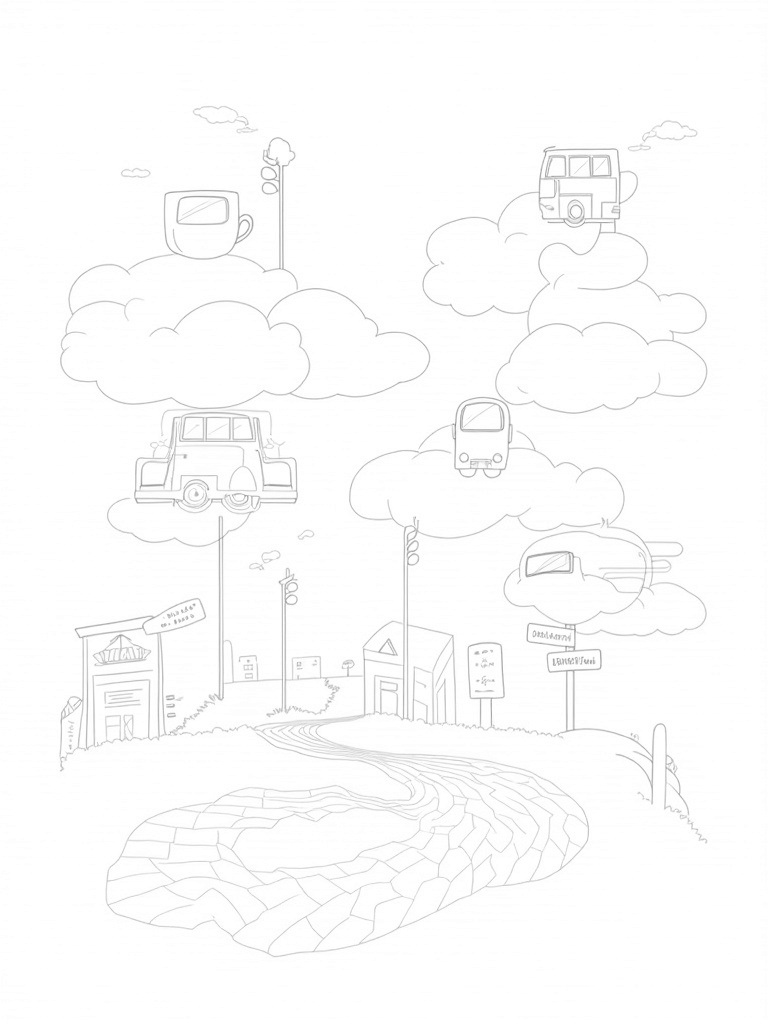 Imagine a city where buses float on fluffy clouds! In this fun scene, you'll find buses shaped like a giant teacup and a blooming flower, drifting happily above a colorful landscape. Below them, oversized traffic lights glow gently in pastel colors, creating a magical vibe.