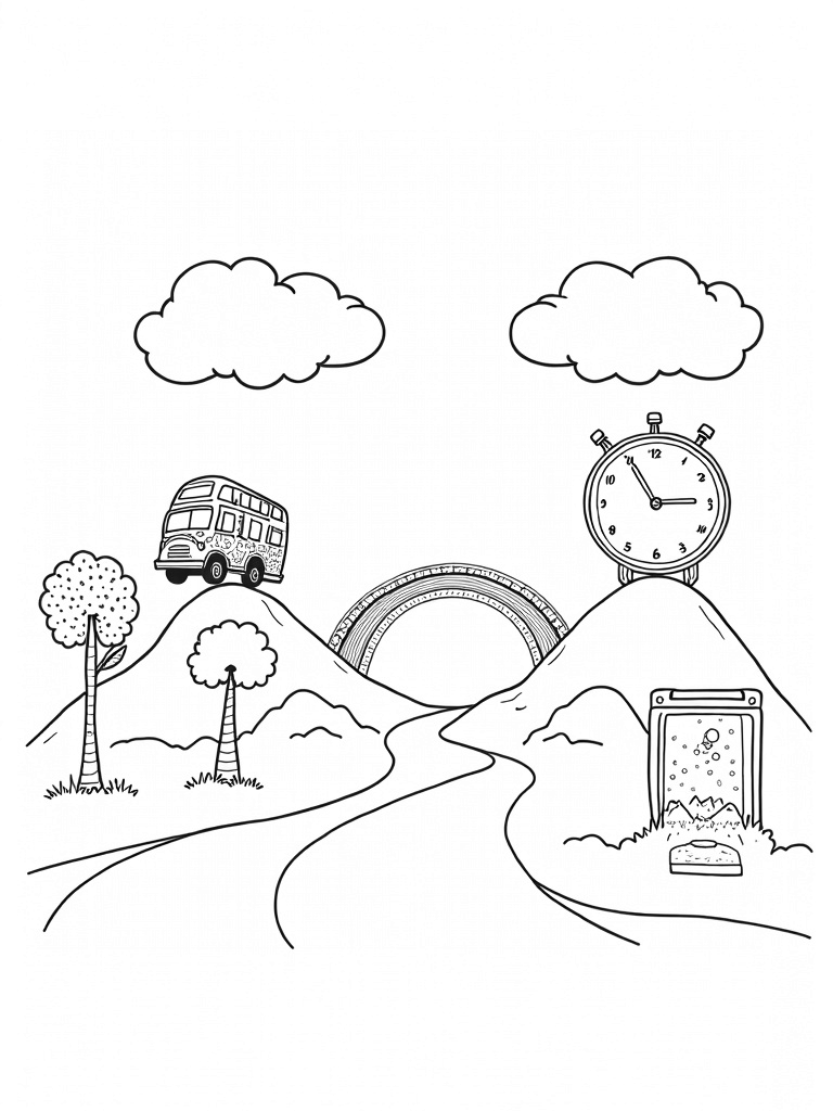 Imagine a city where buses float through a sky filled with giant, fluffy clouds! Beneath them, a winding road is bursting with oversized flowers and spiraled trees. One of the buses is extra special; it's decorated with intricate patterns and magically transforms into a rainbow-colored bridge connecting two grassy hills. How cool is that?