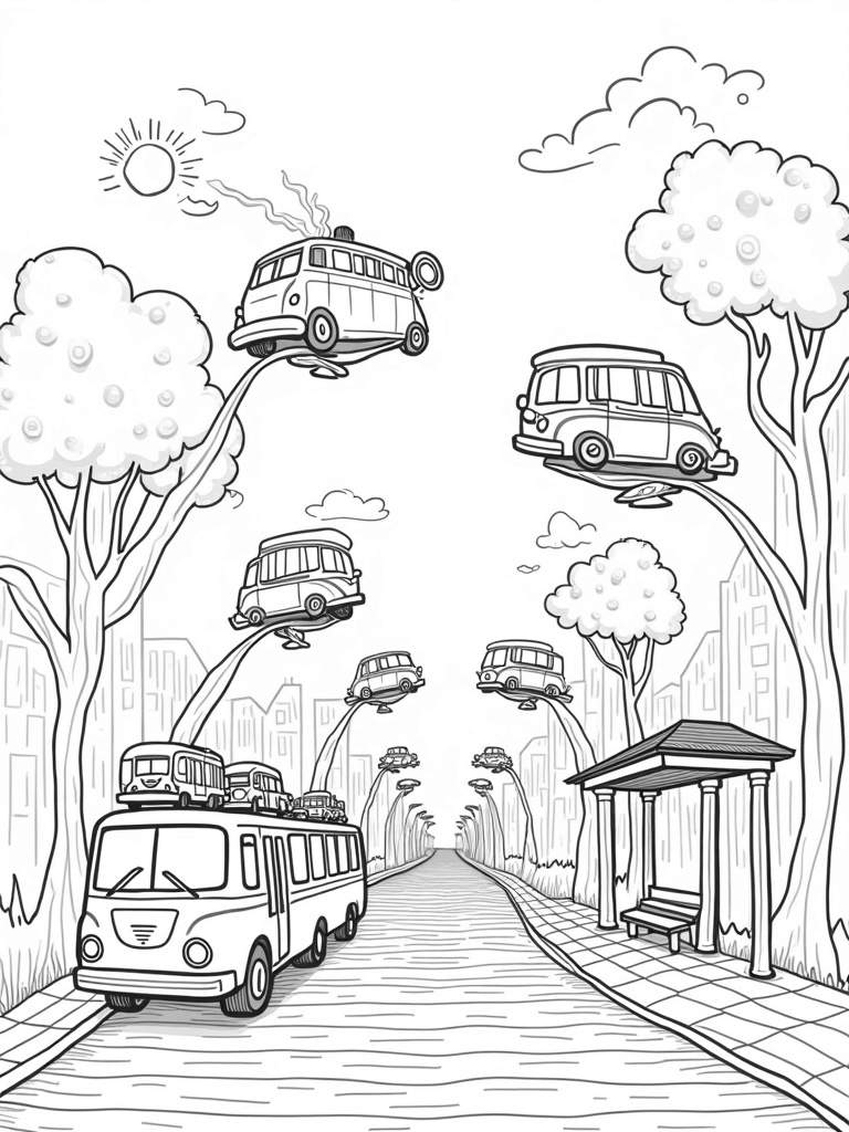 Imagine a city street where buses float just above the cobblestone roads, looking like colorful clouds! One of the buses is shaped like a giant teacup, complete with steam swirling up like it's just brewed a perfect cup of tea. Next to it, there's a huge book bus, its pages flipping in the wind, making it look like a story waiting to be told.