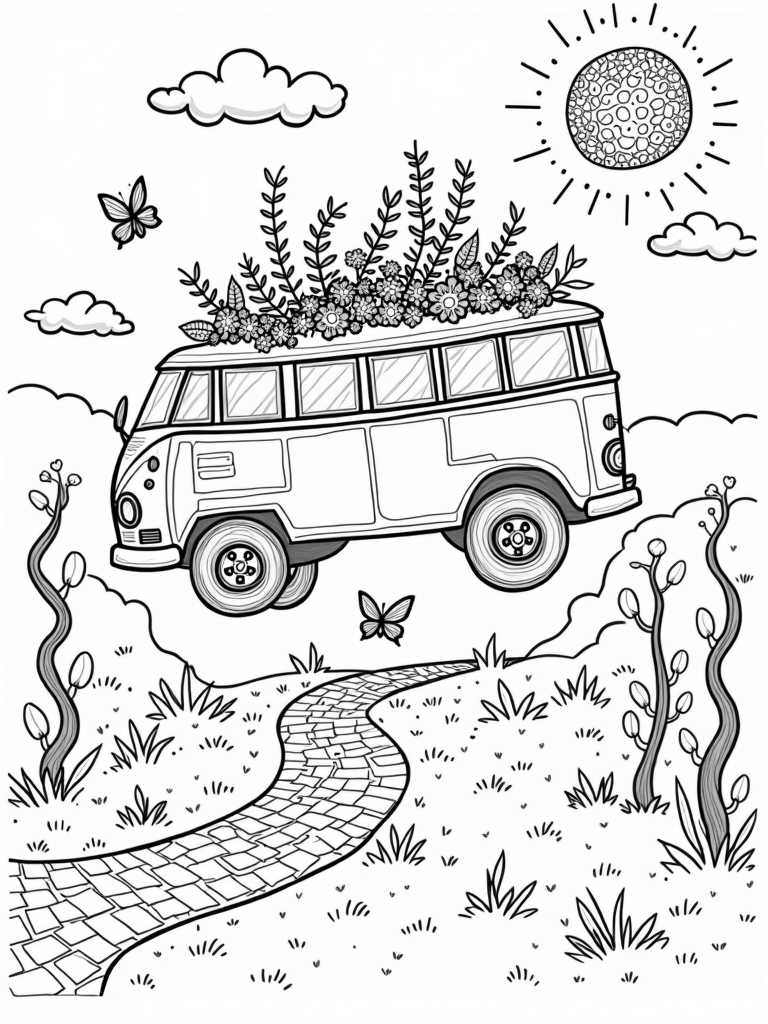 Surrounding our whimsical bus are tall trees with spiraling trunks. Their leaves are shaped like musical notes, creating a symphony of nature all around. In the background, fluffy clouds drift lazily by, resembling giant marshmallows, while a giant sun with intricate patterns shines brightly, bringing warmth and joy to this enchanting oasis. It’s a perfect spot for kids to get creative with their favorite colors!