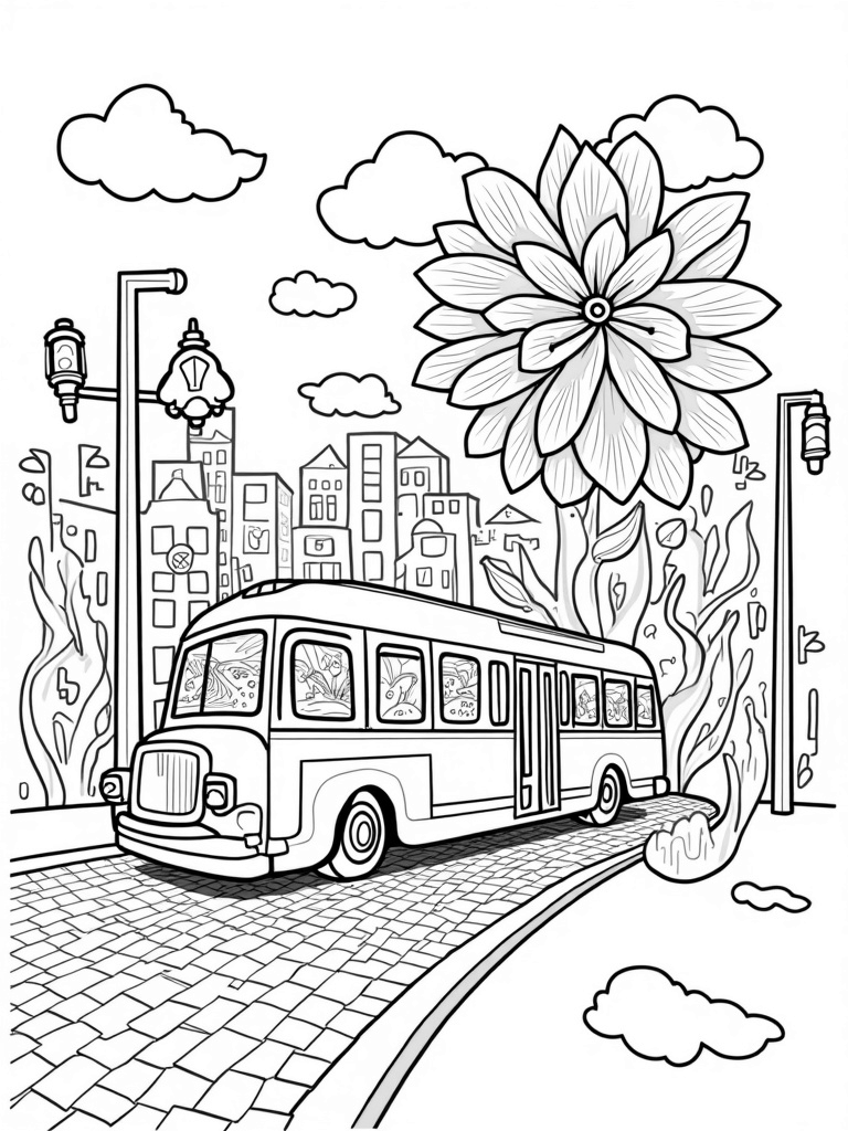 You’ve got to check out this cool cityscape where a bright, cheerful bus transforms into a giant flower! Its colorful petals spread out like wings, making it a sight to behold. Nearby, giant traffic lights hang from swirling vines, lighting up with fun, intricate patterns. Below the bus, the cobblestone road flows like a river, sprinkled with funky, wavy shapes that will keep your imagination buzzing.
