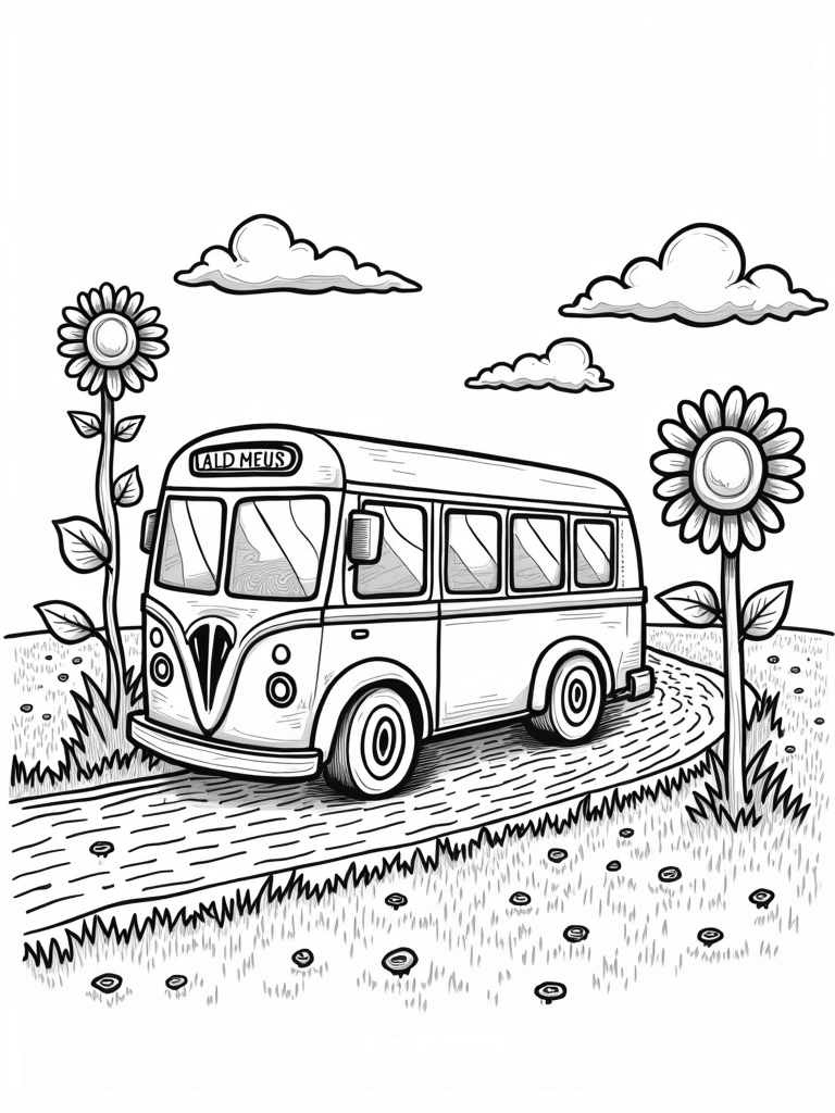 Look up, and you'll see fluffy clouds floating by, each one shaped like different bus models. It’s a fun twist that sparks the imagination! Below, there’s a field of oversized grass, perfect for a picnic or just enjoying a sunny day. This scene is packed with playful details that kids will love to color in.
