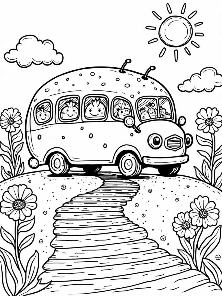 A winding path made of rainbow-colored bricks leads right up to this fun bus. Can you see the butterflies fluttering around? They add an extra touch of playfulness to this already delightful scene. And don’t forget about the fluffy clouds that look just like cotton candy! There’s even a sun shining down with cheerful rays, making everything feel warm and inviting.