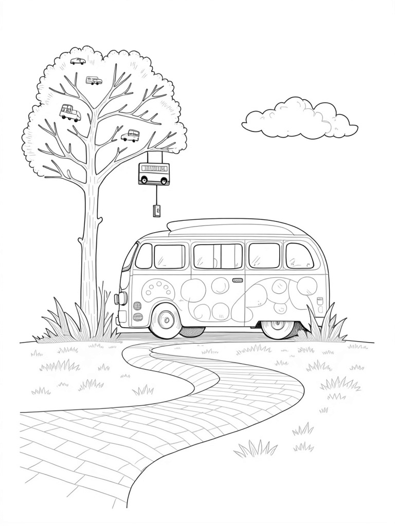 Leading away from the bus is a winding road made of rainbow-colored bricks that stretches towards a dreamy horizon. How cool would it be to travel down that road? And if you look up, you’ll see fluffy clouds shaped like different bus models floating lazily above. There's even a vintage bus sign swinging gently from a branch, welcoming everyone to this whimsical scene!