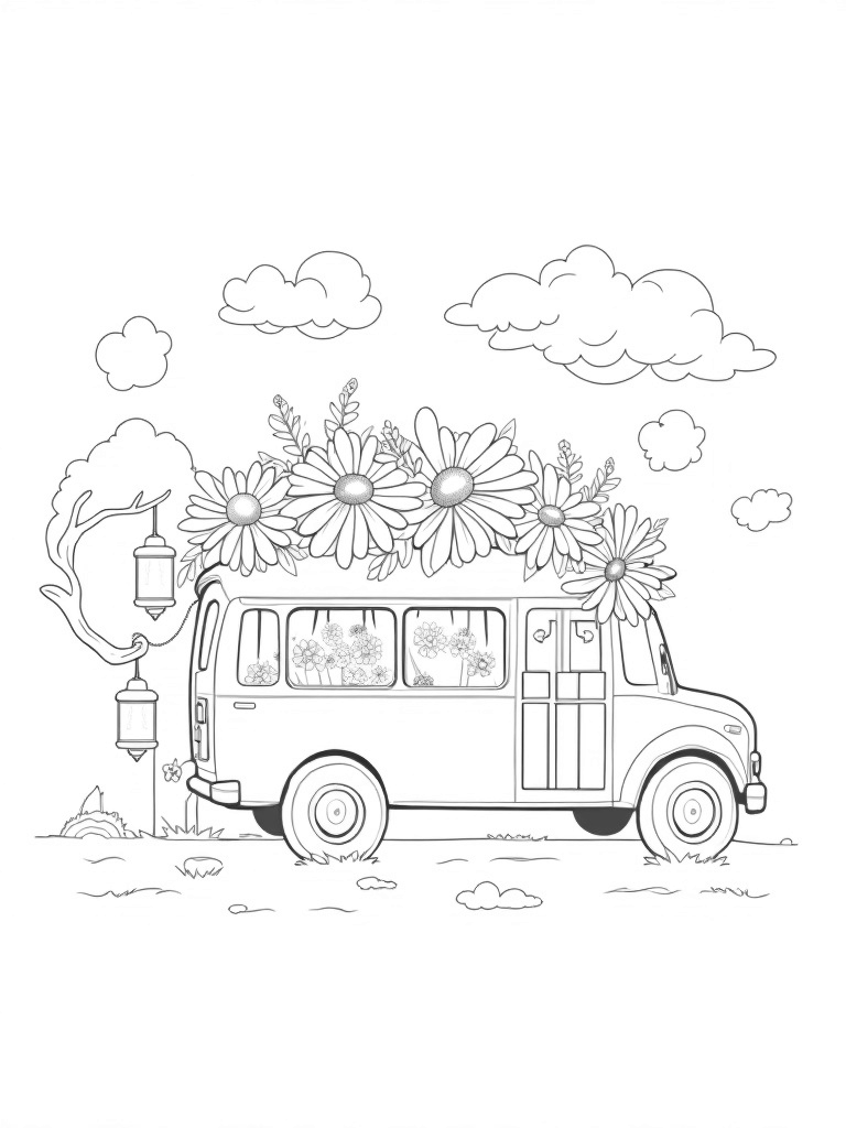 Garden Bus with Flower Wheels and Lanterns Coloring Page