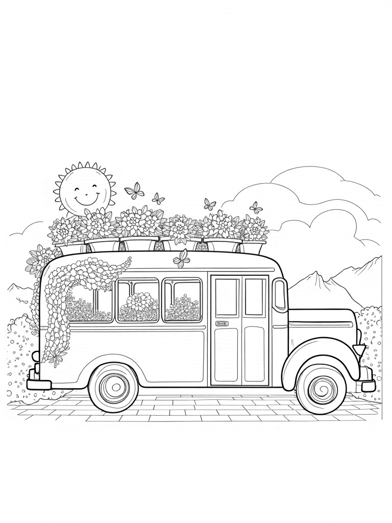 This coloring page shows a magical bus that has transformed into a vibrant garden! You'll see colorful flowers bursting from the windows and vines elegantly draping down the sides. The wheels are oversized flowerpots, overflowing with blossoms, making it look like the bus is rolling through a garden paradise.