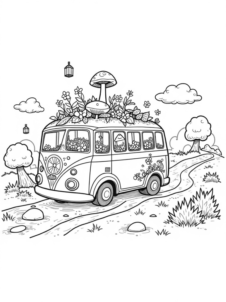 As you color, imagine a gentle stream winding around the base of the bus, with smooth stones dotted along the water’s edge. Nearby, floating lanterns sway lightly in the breeze, casting a warm glow on everything. Look out for the winding road that leads into the distance, flanked by vibrant shrubs and tall trees. It’s a scene straight out of a fairytale!