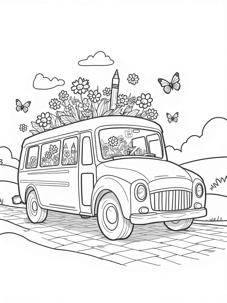 Imagine a bus that's not just for driving, but for blooming! This playful scene shows a bus transformed into a garden on wheels, with vibrant flowers bursting out of every window. The wheels are oversized sunflowers that seem to spin gently as the bus rolls down a cobblestone path. Butterflies flutter around, adding a touch of magic to this colorful ride.
