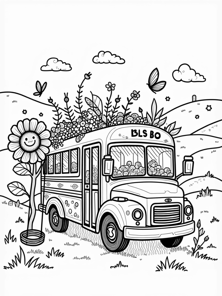 Imagine a bus that has turned into a colorful garden! The outside is bursting with blooming flowers and playful vines that twist all around. Its windows are surrounded by big, leafy greens, and there are butterflies flitting about, adding even more color to the scene. Right at the front, a giant sunflower smiles up at the sun, making it the star of the show.