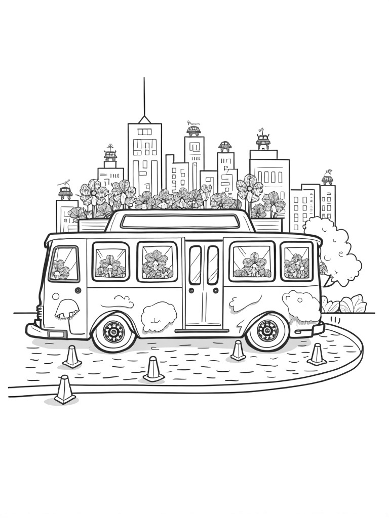 Imagine a bustling city where a giant, colorful bus has turned into a stunning flower garden! The bus’s windows are bursting with vibrant petals, while huge leaves spread out from the roof, making it look like a magical oasis right in the middle of the city. As you color, you can almost hear the laughter of kids playing around this cheerful scene.