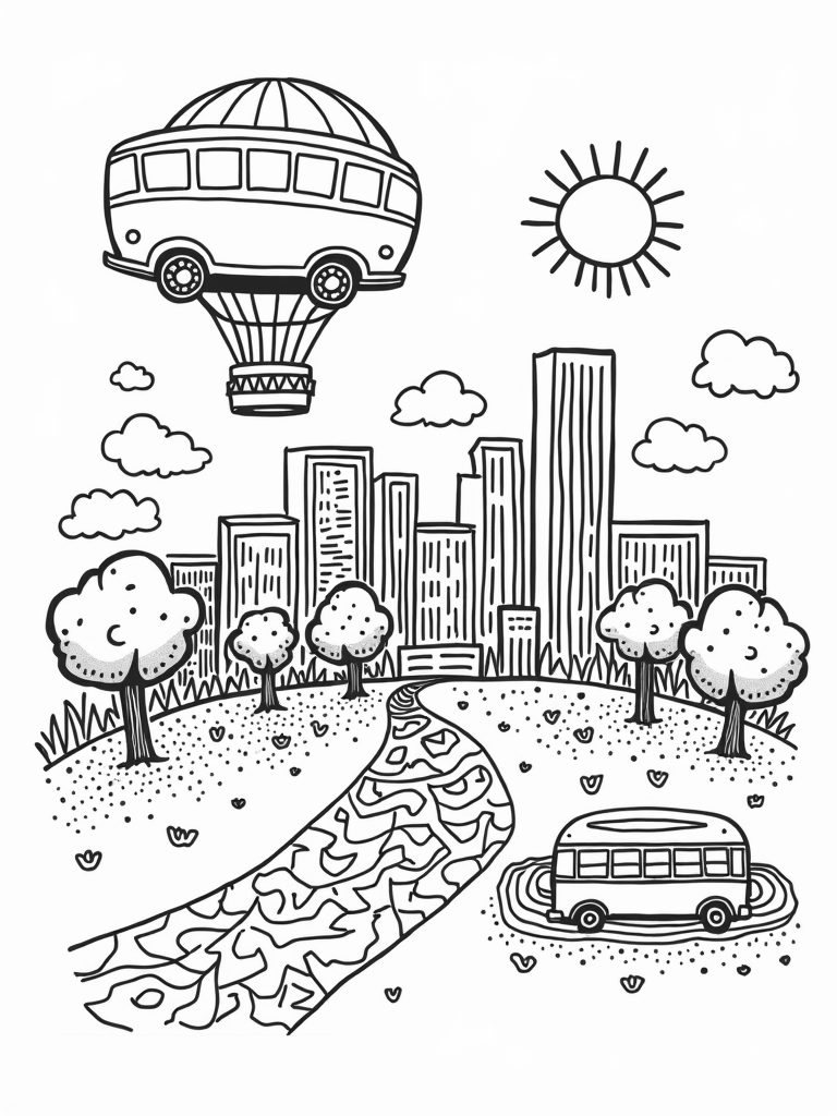 Discover this free, printable coloring page featuring a whimsical cityscape with a giant bus-shaped hot air balloon. Perfect for kids who love buses and vibrant colors, this coloring page brings a fun twist to city life!