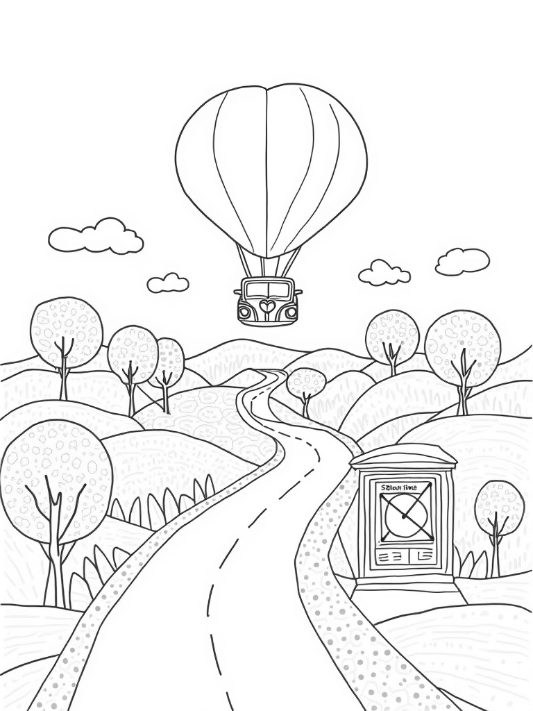 Imagine a city where the skies are filled with a giant bus-shaped hot air balloon floating above the rooftops! Below it, a winding road shaped like a ribbon twists and turns, lined with oversized trees that look just like traffic lights. It's a playful scene that invites you to color outside the lines!