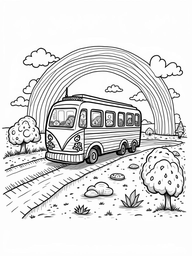 Picture a bus that looks like a giant pencil rolling through a bright and lively landscape! Its wheels are erasers, and it’s decorated with cheerful sketches of flowers and trees. Above, a vibrant rainbow stretches across the sky, with fluffy clouds shaped like thought bubbles, adding a sprinkle of imagination to the scene.