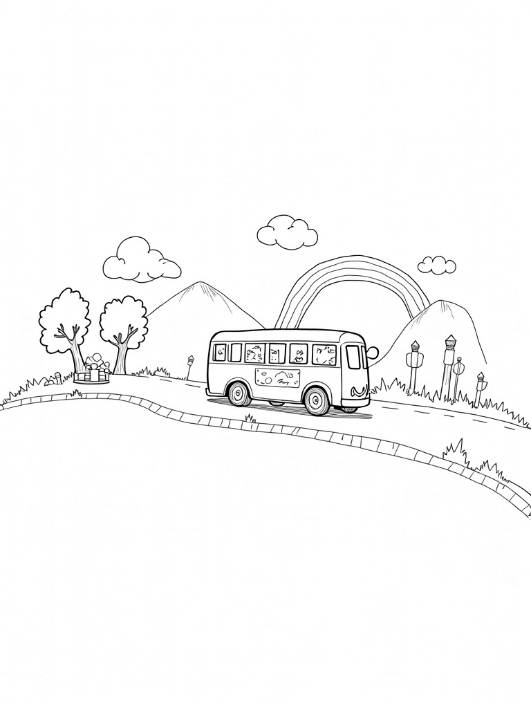 This fun illustration showcases a giant pencil bus rolling down a winding road made of colorful crayons. The bus has oversized paint palette windows filled with vibrant hues just waiting to be colored. Along the roadside, you'll find lush trees whose leaves resemble paintbrushes, adding a creative touch to the scene. And don't miss the oversized erasers sitting like cozy seats along the path!