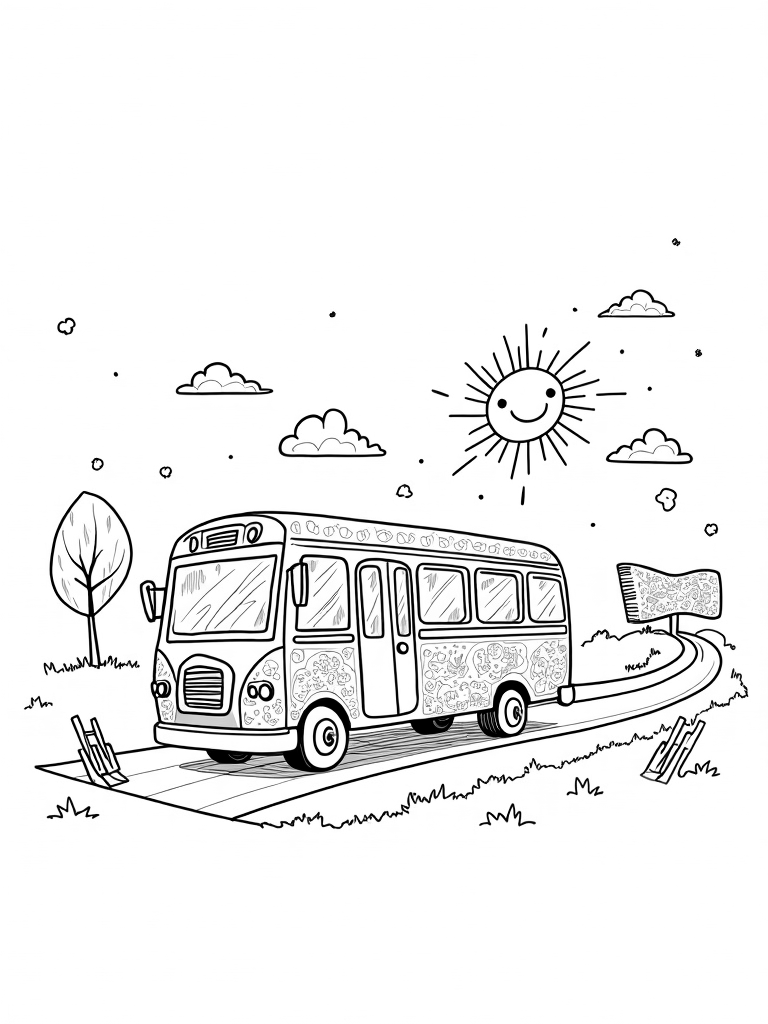 You’ve got to check out this coloring page! It shows a super fun bus shaped like a giant pencil, rolling down a twisted road made of lined notebook paper. The bus is covered in colorful doodles, so you can get creative with your colors! Along the way, you’ll see oversized erasers acting as roadblocks, which adds a playful touch to the scenery.