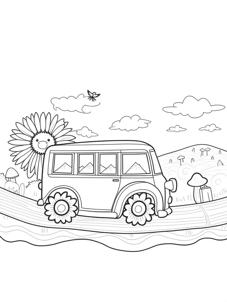 This coloring page shows a bus that's totally unlike any you've seen before! It's shaped like a giant sunflower, with bright yellow petals that stretch wide open. Look closely and you'll see the windows filled with vibrant landscapes just waiting for your favorite colors. The wheels are oversized daisies in all sorts of shades, adding a fun twist to this unique ride.