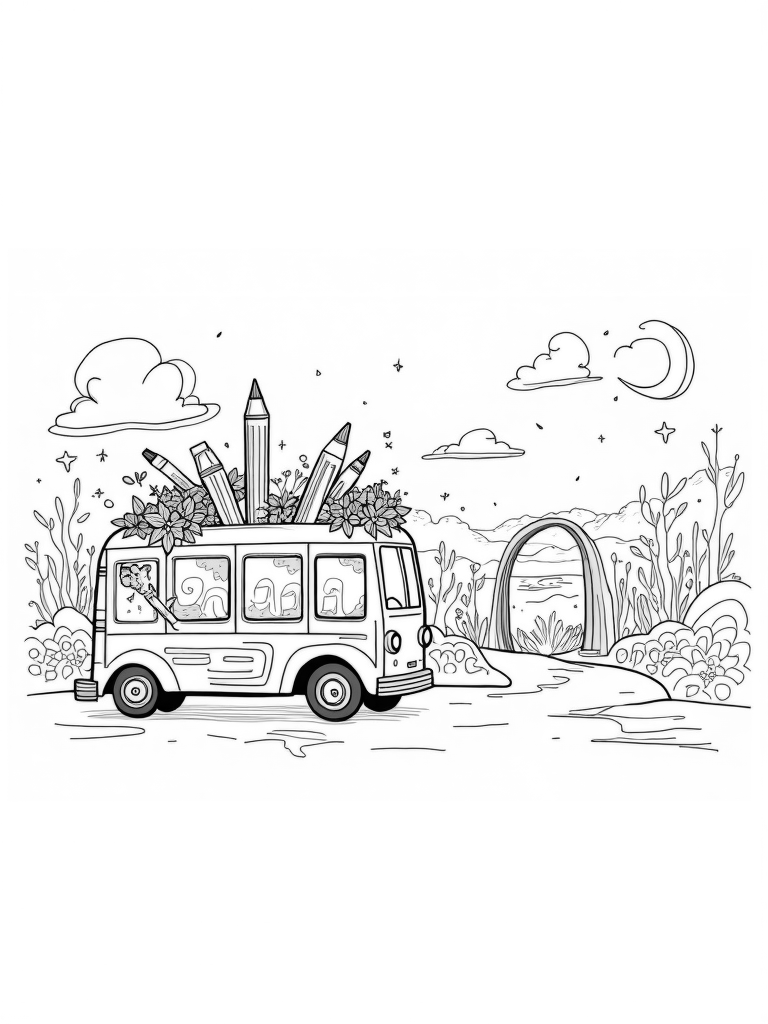 Gigantic Rainbow Bus Art Studio Coloring Page
