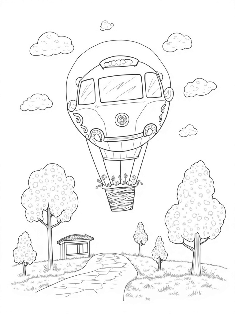 As you grab your crayons or markers, take a moment to look closely at the details. The hot air balloon's basket is made from woven vines, and nearby, colorful luggage tags dangle from a tree branch, swaying gently in the breeze. And don’t forget the fluffy clouds shaped like different bus models drifting lazily in the sky! There's so much to bring to life with color.