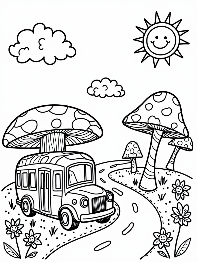 Imagine a giant ladybug that doubles as a bus! It's parked snugly under a colorful mushroom that looks like it came straight from a fairy tale. Around the bus, you’ll find flowers with big, happy faces, blooming in vibrant colors. Each flower seems to dance in the breeze, adding to the cheerful vibe of the scene.
