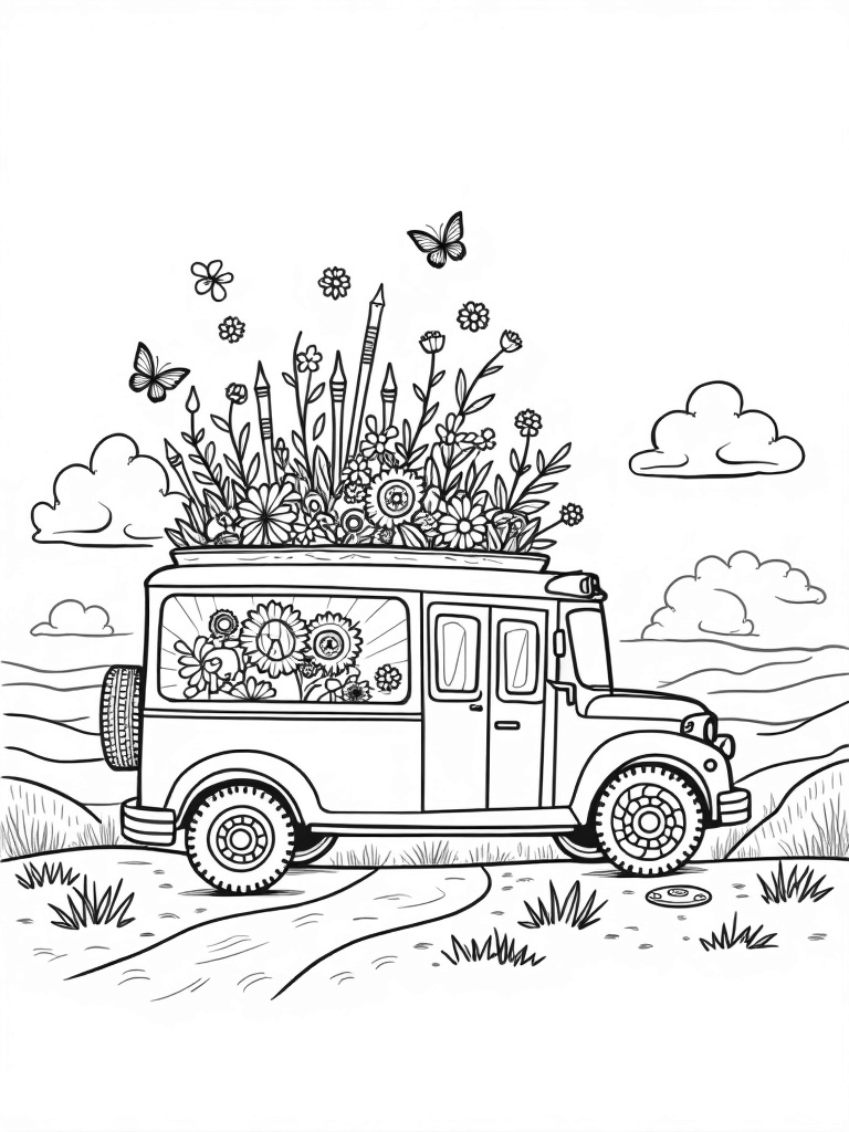 Mobile Garden Bus with Paintbrushes and Butterflies Coloring Page