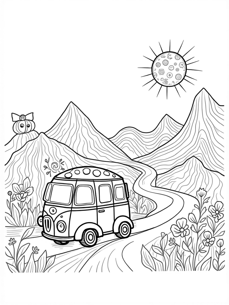 A giant mushroom-shaped bus is the star of this colorful scene! Its exterior is bursting with playful patterns, and the oversized windows look just like flower petals, making it super fun to color. Next to the bus, a winding road made of colorful yarn threads twists through a magical landscape filled with huge, spiraling leaves and vibrant flowers. The background features rolling hills shaped like waves, each adorned with intricate geometric designs that will keep little hands busy.