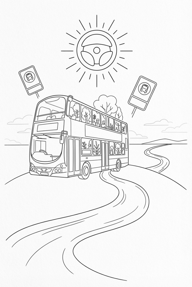 When you grab your crayons, think about making the hill a warm earth tone and the bus a bright primary color so it really pops. The river works great in cool blues or greens, and the clouds are perfect for soft pinks or lilacs. Give the floating signs a bold hue, and let the steering‑wheel‑sun shine in yellows or oranges for extra cheer.