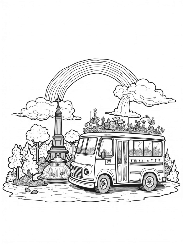 In the background, a towering bus seat stands proudly like a monument, covered in bright banners and climbing vines. The sky above is filled with swirling clouds of colorful exhaust, blending into a vibrant rainbow. It’s a fun and imaginative twist on city life that invites you to color outside the lines!