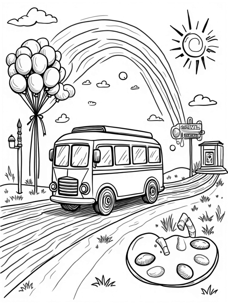 Check out this fun bus coloring page! It features a pencil-shaped bus on a crayon road, oversized paintbrush streetlights, and even a rainbow. Perfect for kids who love art, this free, printable coloring page is a great way to spark creativity.