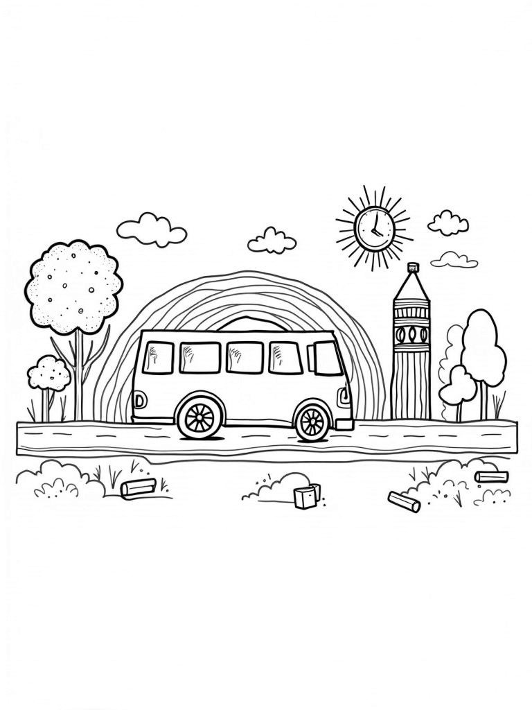 In this fun coloring page, you’ll find a giant, rainbow-shaped bus parked on a winding road made of colorful pencil crayons. The bus is surrounded by vibrant trees that look like paintbrushes swaying in the breeze. There’s also a quirky clock tower nearby, complete with gears made from all sorts of art supplies!