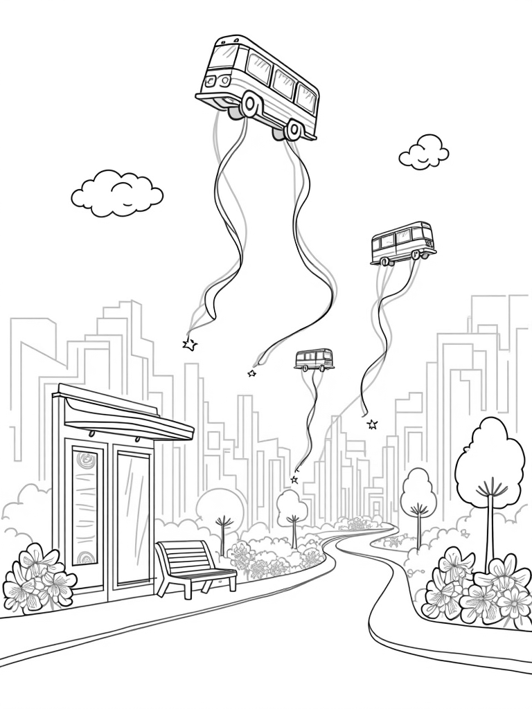 Imagine a city where buses don’t just drive down the streets, but float through the sky like colorful balloons! In this bustling scene, each bus leaves behind a trail of vibrant ribbons that twist and twirl, connecting to giant traffic lights hanging from fluffy clouds. Below, there's a lovely park filled with oversized flowers and giant benches, making it the perfect spot for a picnic or just to relax and enjoy the view.