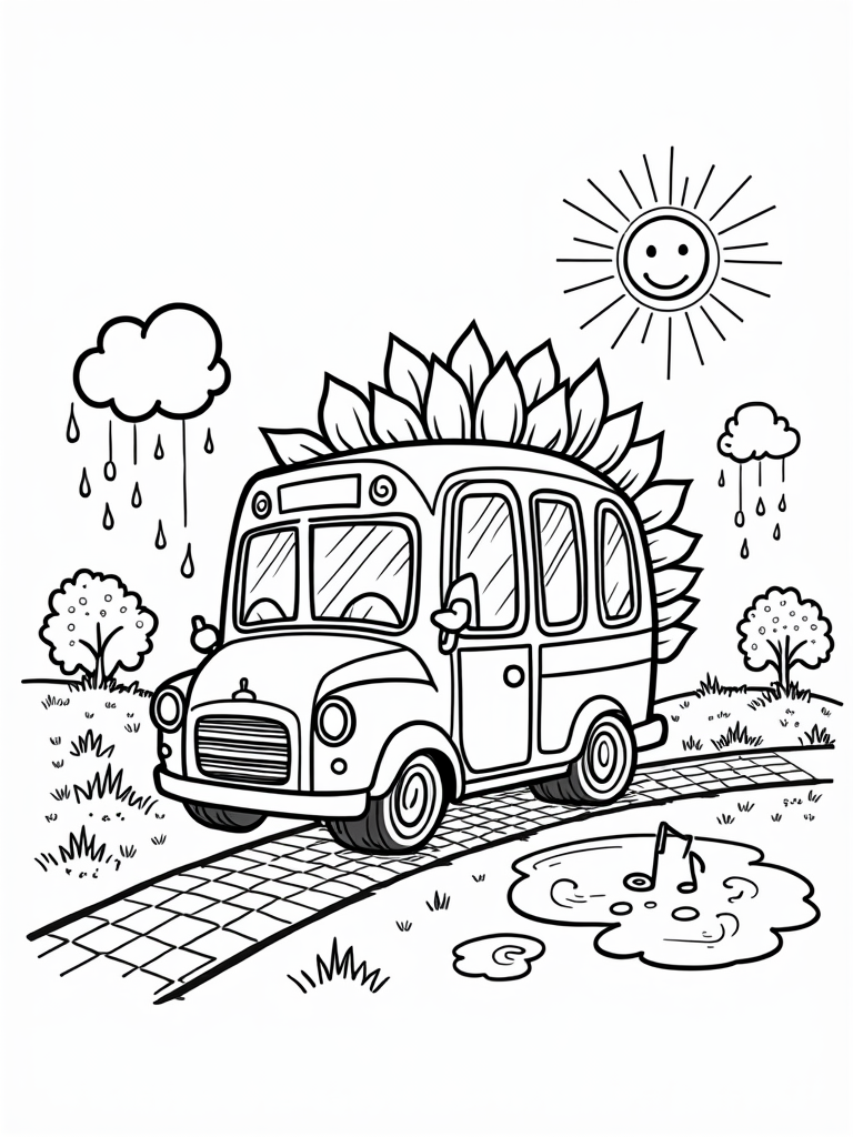 This coloring page showcases a delightful bus that looks just like a giant sunflower! The vibrant petals spread out all around, making it a cheerful sight. If you look closely, you'll spot windows shaped like happy ladybugs peeking out from the sides. Isn't that fun?