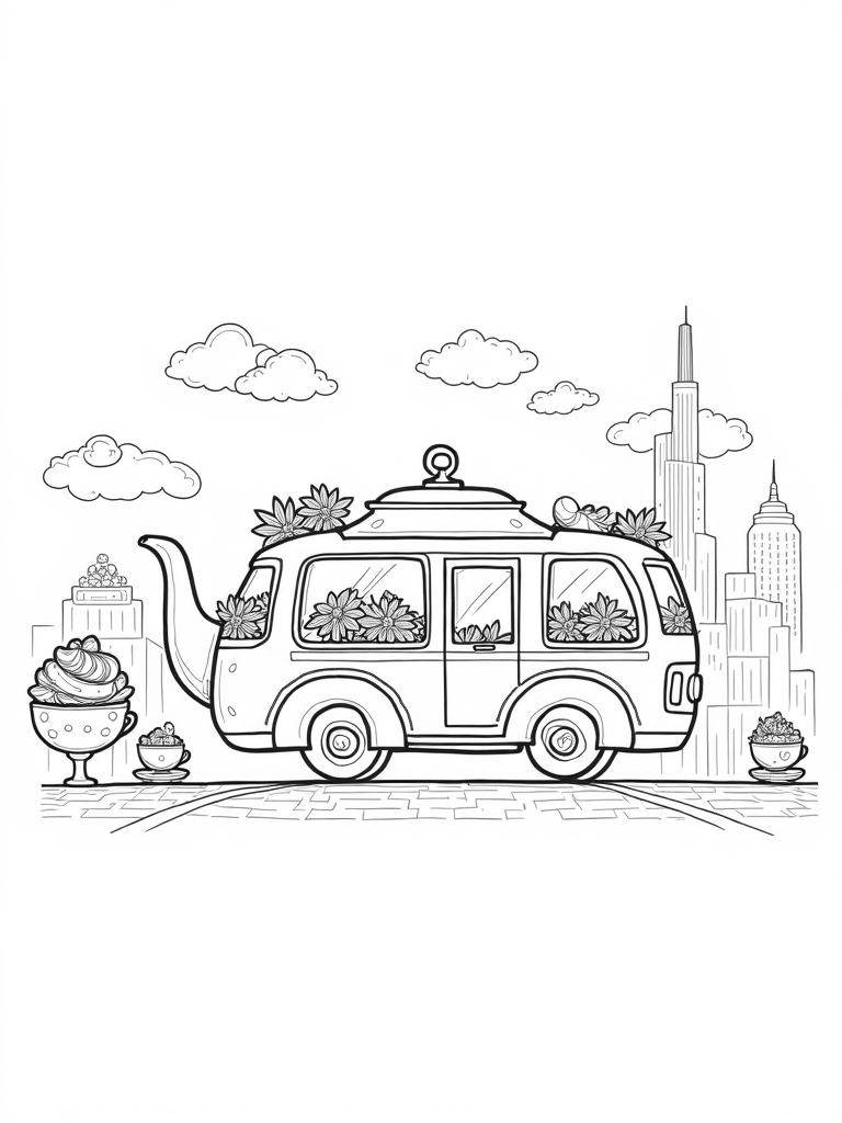Teapot Bus with Flower Windows and Teacup Bus Stops Coloring Page